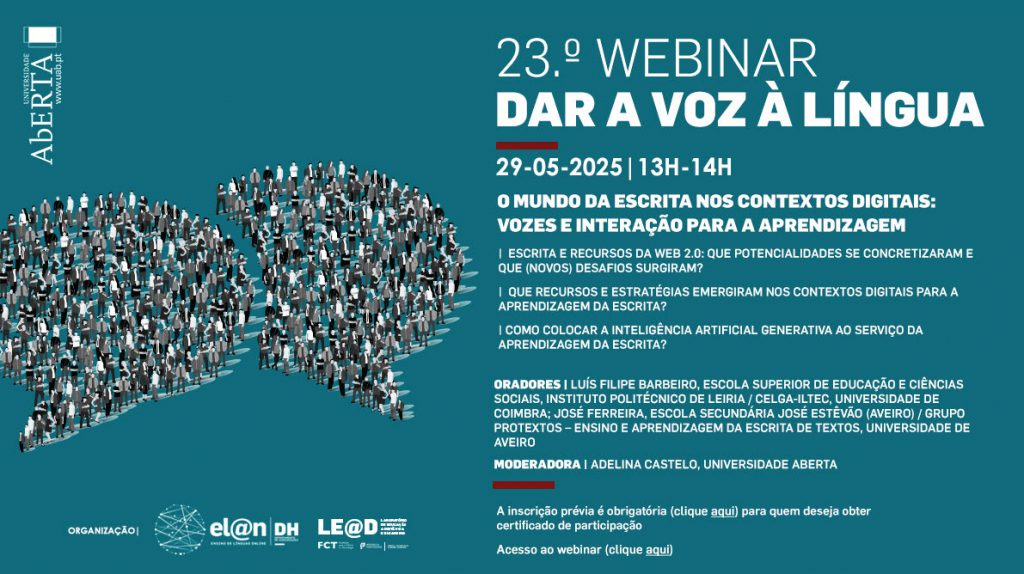 O 23.° webinar “dar a voz à língua”, subordinado ao tema “O mundo da escrita nos contextos digitais: vozes e interação para a aprendizagem”, realiza-se online, entre as 13h00 e as 14h00, no próximo dia 29 de maio de 2025.